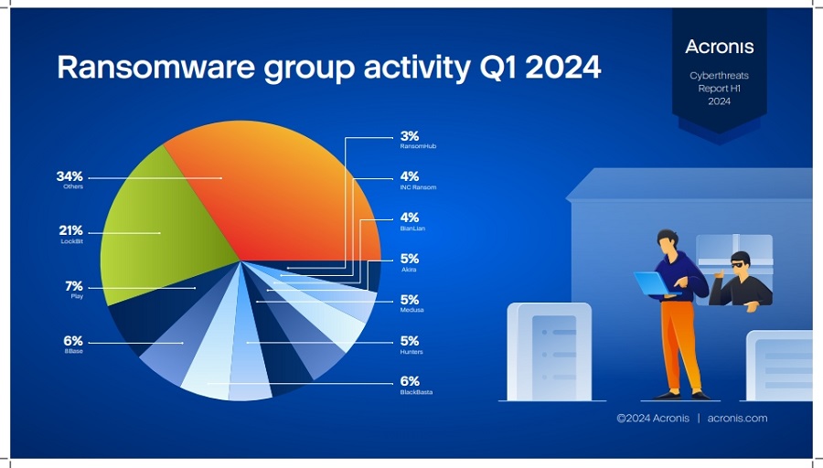 Рансъмуерът продължава да бъде сериозна заплаха за малките и средните предприятия, особено в критични сектори като държавен и здравеопазване. През първото тримесечие на 2024 Acronis наблюдава 10 нови рансъмуер групи, които заедно са осъществили 84 кибератаки в световен мащаб, като най-активни сред тях са били LockBit, Black Basta и PLAY, които са отговорни за 35% от атаките.