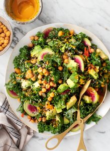 - Добавете моркова, цвеклото, репичките, половината от авокадото на кубчета, боровинките, пепитата, още няколко щипки сол и. Полейте обилно с дресинга с моркови от джинджифил. Отгоре се залива с останалото авокадо, още дресинг, печеният нахут и се поръсва със сусам. Подправете на вкус и сервирайте!