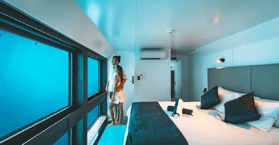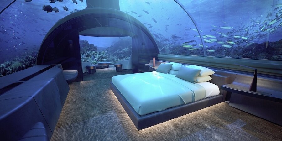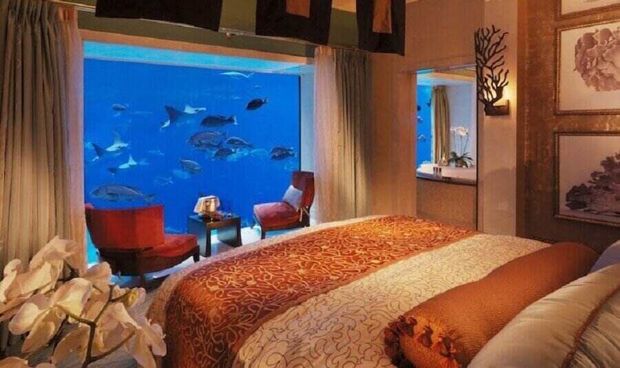 Подводните апартаменти в Atlantis the Palm в Дубай са урок по лукс. Огромните прозорци от пода до тавана, осигуряват невероятна гледка към морския живот от леглото ви, са само черешката на тортата. Наречени Посейдон и Нептун на морските богове, апартаментите се предлагат и с 24-часова услуга иконом. И въпреки, че апартаментите не са във морето, гледката им към 65 000 морски животни от аквариума Ambassador Lagoon създава тази илюзията.