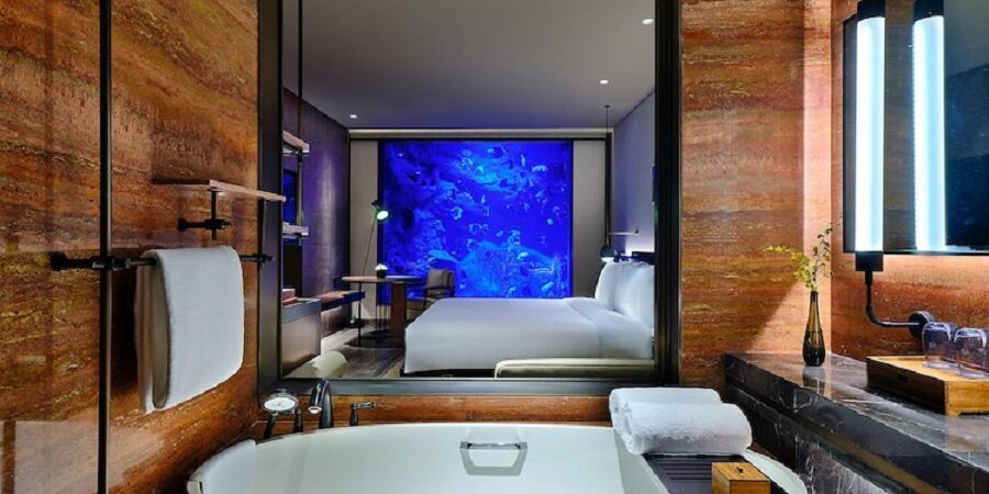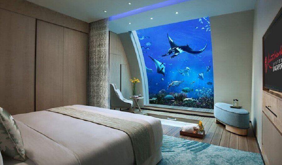 Resorts World Sentosa в Сингапур предлага 11 Ocean Suites, построени като градски къщи на две нива – горна, жилищна зона и подводни спални камери, апартаментите предлагат най-доброто от двата свята. Вашият личен иконом ще се погрижи за вас, докато гледате най-големия аквариум в света.