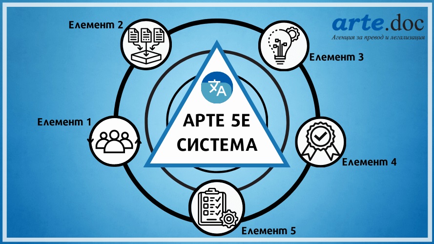 В агенция за преводи Арте.Док използваме собствено разработена АРТЕ 5Е система „Гарантиран качествен превод“. Имаме строги процеси за контрол на качеството, работим само с квалифицирани експертни преводачи и сме защитили Европейски стандарти за преводачески услуги (ISO 17100), за Контрол на качеството (ISO 9001) и дори за Редакция на машинен превод (ISO 18587).