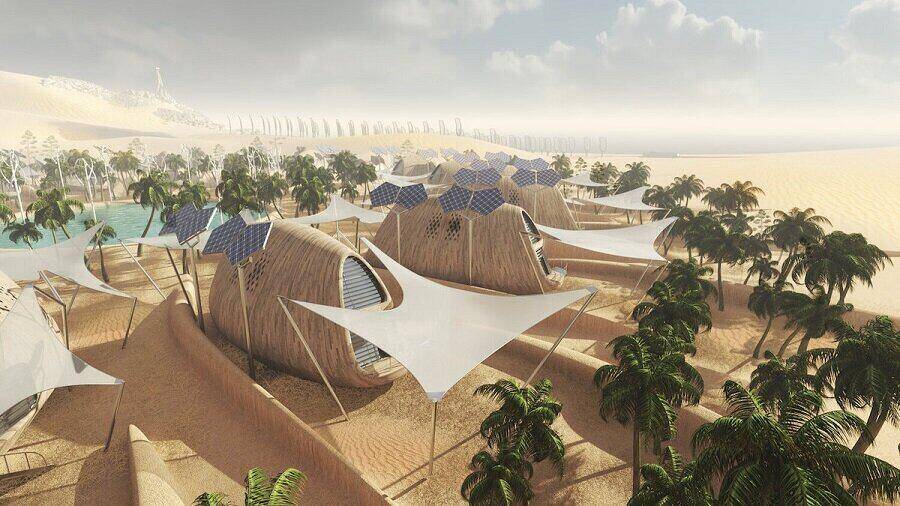 Между каютите, опънати конструкции осигуряват сянка и облекчение от суровото слънце, докато слънчевите панели използват природния ресурс, за да произвеждат енергия за общността.