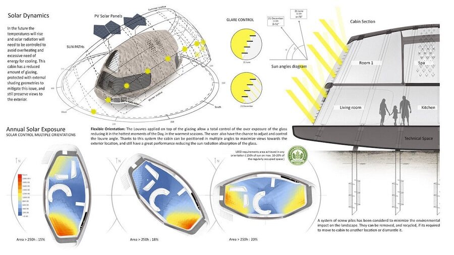 В мащаб на сградата, формата на всяка кабина е внимателно планирана, за да отговаря най-добре на околната среда – фактори като вятър, ерозия на почвата и необходимостта от звукопоглъщане заради близкото съседство, определяха формата на биокабините.