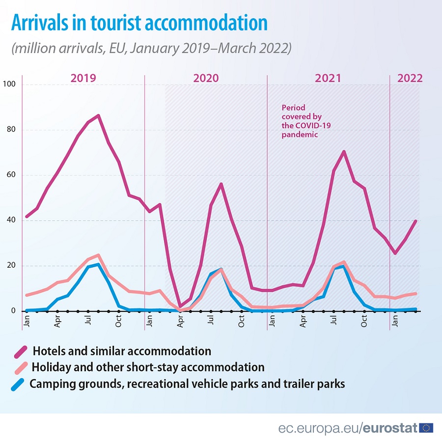 Докато при посещенията на хотели, ваканционното настаняване и други места за кратък престой има резки спадове по време на пандемията през последните сезони (отбелязани в тъмно и светло розово), то настаняването на площадки за къмпинг, каравани или кемпери остава почти непроменено (отбелязано в синьо).