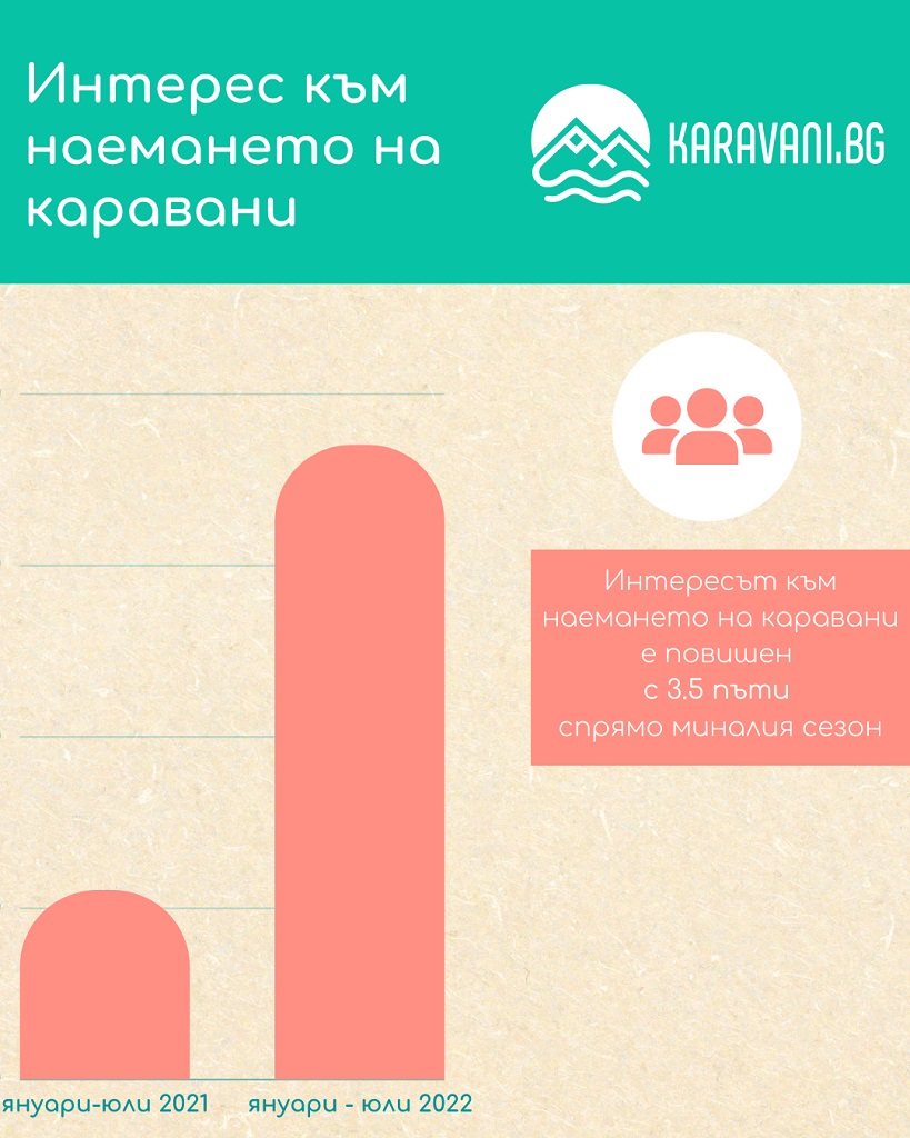Интересът към наемането на каравани е значително повишен – с 3.5 пъти спрямо миналия сезон. 37 000 души са търсили каравани в сайта от началото на годината до 15 юли, спрямо малко над 11 000 за същия период през 2021 г. Едновременно с това расте и броят на предлаганите каравани – в момента в платформата са се включили над 100 каравани, което я превръща в най-голямата в страната.