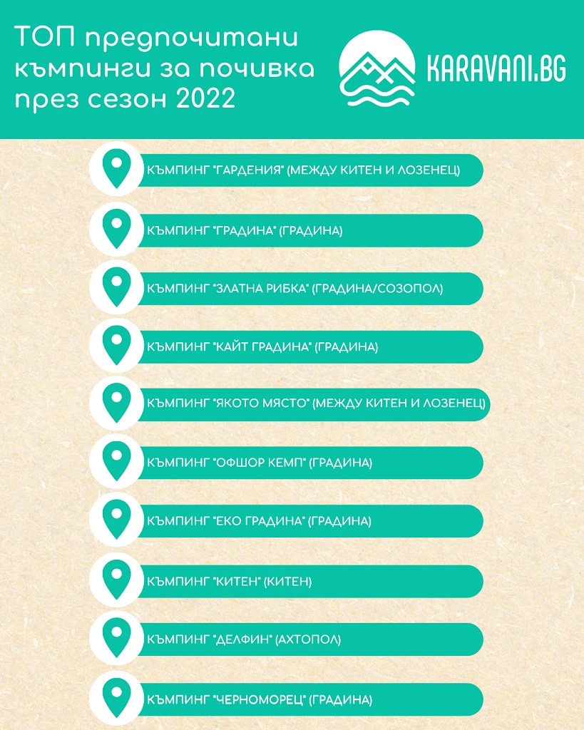 Тази година се забелязва и нова тенденция – търсенето на каравани на къмпинг „Гардения“, между Китен и Лозенец, задминава досегашния първенец в Karavani.bg – „Градина“. Най-популярните дестинации за почивка на каравана у нас са по Южното Черноморие – около Китен и Лозенец (къмпингите „Гардения“, „Якото място“, „Китен“, „Атлиман“), между Созопол и Черноморец (къмпингите „Градина“, „Златна рибка“, „Кайт градина“, „Еко гадина офшор кемп“, „Черноморец“), както и къмпинг „Делфин“ около Ахтопол. Извън Черноморието, на голям интерес в букинг платформата Karavani.bg се радва и къмпинг „Иструм парк“ на яз. Искър.