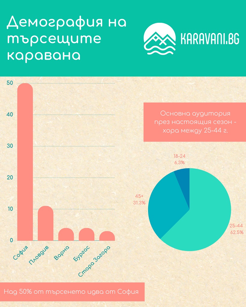 Най-активно каравани търсят млади хора и семейства от големите градове – основната аудитория на Karavani.bg този сезон са хора между 25 и 44 г., като над 50% от търсенето идва от София. Пловдив, Варна, Бургас и Стара Загора пък са останалите най-популярни градове на търсещите да наемат каравана на морето. За планирането на семейната почивка основно грижата е на жените, които са много по-активни в търсенето и избирането на дом на брега на морето, показват данните на букинг платформата за този сезон.