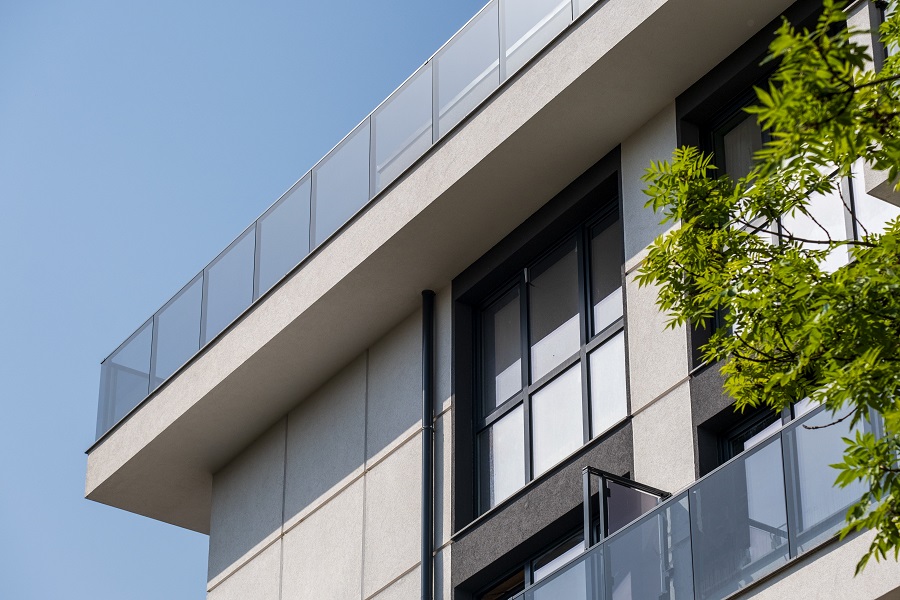 Използвана е Баумит система за лепене на камък върху топлоизолационна система за партера и кулата, бялата мазилка е прецизно растерирана чрез PVC профил в топлоизолацията, което придава допълнителна пластика. Използваните премиум мазилки НанопорТоп и ПураТоп за тъмния цвят гарантират дълготрайността на фасадата и запазването на нейния блясък.