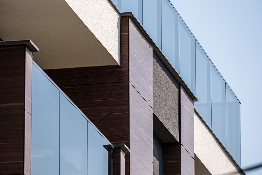 Фасадата е овладяна с ритмични обеми и комбинация от материали. Залага се на качествен детайл и изчистена линия. Липсва излишна пищност. Тук в най-голяма степен си проличава синергията между проектант, изпълнител и Баумит технология. Комбинацията от окачена фасада от HPL с дървесен декор, цялостна топлоизолационна система Про и травертин придават динамика, но и топлота на фасадата.