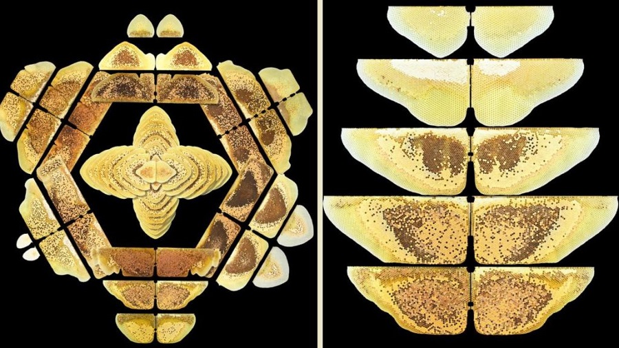 Но това ново проучване разкрива, че съдържанието на всяка страна на гребена също се отразява взаимно. Независимо дали става дума за мед, прашец или клетки за отводки, всеки елемент се появява на огледални места от двете страни на питата, като образува организирана, балансирана система през целия жизнен цикъл на пчелното семейство.