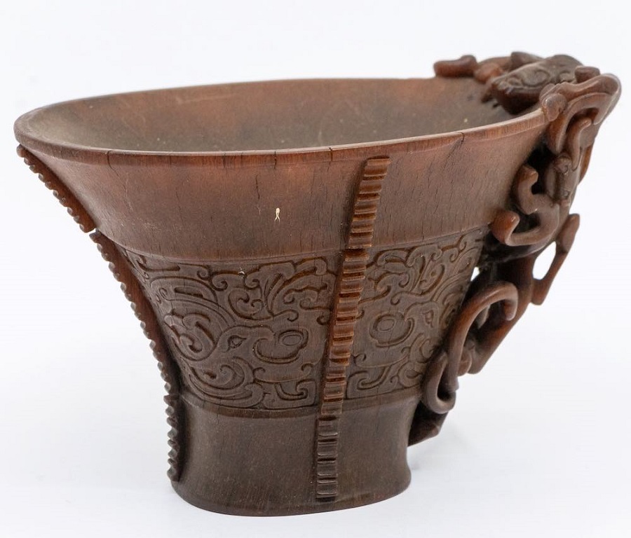 „Друг игрив дракон е издълбан на противоположната страна. Чашите от рог на носорог са били използвани за общо пиене при важни церемониални поводи в китайските научни кръгове. Смятани са за магически предмети. В древен Китай даоистите вярвали, че рогът ще промени цвета си, за да предупреди пиещия за наличието на отрова.“