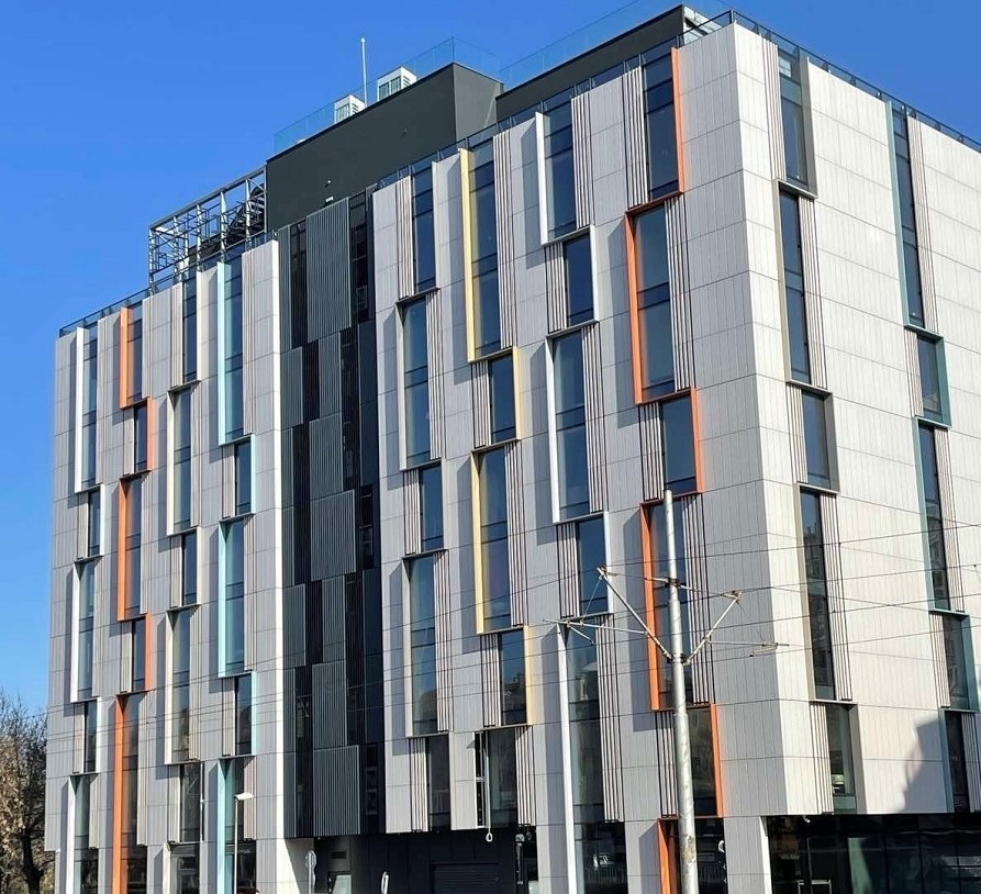 Екстериорът на сградата е изпълнен изцяло от фирма „Чех Пласт“ ООД по проекта на арх. Искрен Манев от „ЛП АРХ“ ООД, окачена фасада на фирма „Schüco”, система FWS 50, керамичната облицовка и багети, производство на испанската фабрика „Ceramica Mayor SA“ – Tempio в цвят white palma, алуминиеви слънцезащити Е66 и композитен панел – еталбонд на гръцката фирма ЕТЕМ в RAL 7016, вградени прозорци и врати с профили и системи на фирма Schüco.