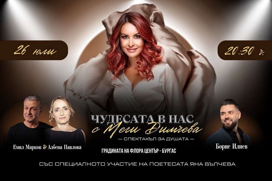 След невероятно успешната премиера в София, спектакълът – преживяване за душата „Чудесата в нас“ ще гостува в Бургас. Телевизионната водеща Меги Димчева ще сътвори поредното чудо, за да ви накара да обичате себе си през медитацията, красивите български песни, поезията.