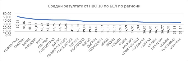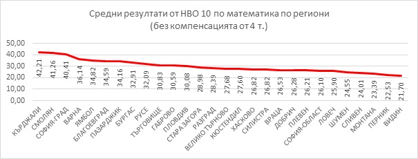 По традиция сред регионите с най-висок среден резултат са София-град, Смолян и Варна. По математика първенец обаче е област Кърджали. Леки размествания се наблюдават при регионите с най-малък среден брой точки, като Разград е излязъл от последната тройка и по двата предмета. По-назад се е придвижила област Монтана.
