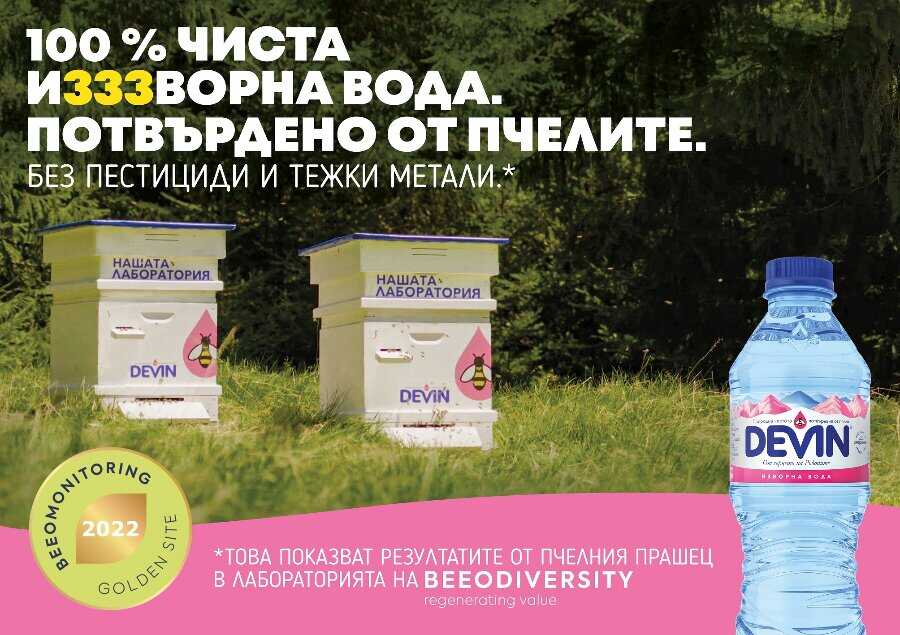 Водещата у нас компания за минерална и изворна вода „Девин“ получи златния медал на международната организация BeeOdiversity. Отличието се присъжда за постоянно високи резултати през годината за опазването на дивата природа с помощта на обективен BeeOmonitoring (биомониторинг), патент на BeeOdiversity, който се осъществява благодарение на пчелни семейства, отглеждани в защитената вододайна зона на изворната вода DEVIN. Четири пъти в годината BeeOdiversity анализира проби от прашеца, който пчелите събират в радиус от 1,5 км около извора. Проверяват го за наличие на над 500 различни вида пестициди и тежки метали, нива на биоразнообразие и качество на околната среда. Тази детайлна информация доказва, че регионът на водовземане е далеч от замърсяване и аграрна дейност.