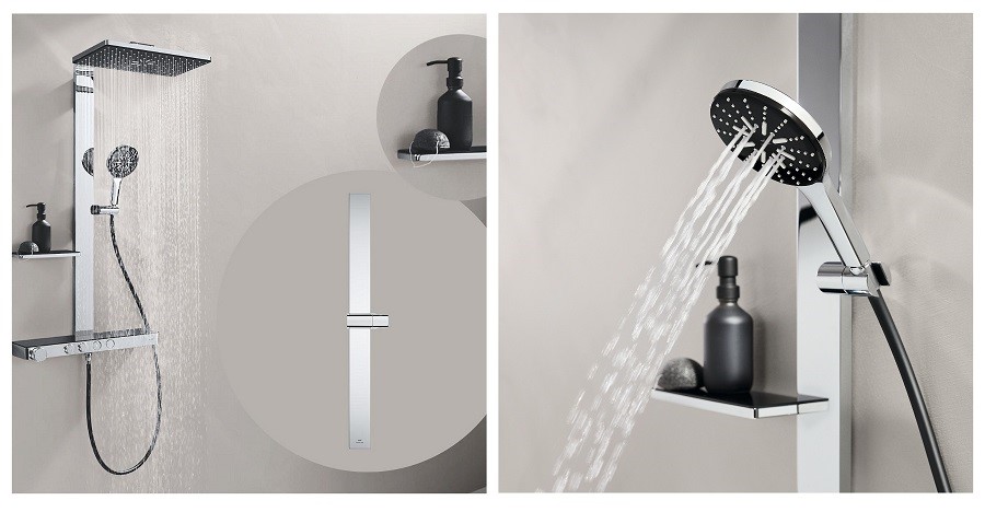Душ системата може да бъде обогатена с регулируем по височина рафт от висококачествени материали като безопасно стъкло и метал, осигуряващ допълнително място за съхранение и елегантно допълващ визията. Със своя адаптивен дизайн, GROHE Rainshower Aqua Pure разширява висококачественото портфолио на GROHE SPA и се съчетава безупречно със смесители като GROHE Allure, създавайки хармонично пространство, изпълнено със спокойствие и изисканост.