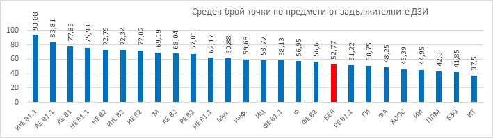 С най-висок среден брой точки са чуждите езици. Сред високите е и средният резултат на втората задължителна матура по математика – 69.19 точки. В другия край се нареждат природните науки, информационни технологии, география и икономика, предприемачество. Сравнително слаб е и средният резултат по изобразително изкуство, което се дължи по-скоро на нисък брой точки на затворените отговори, отколкото на практическата задача.