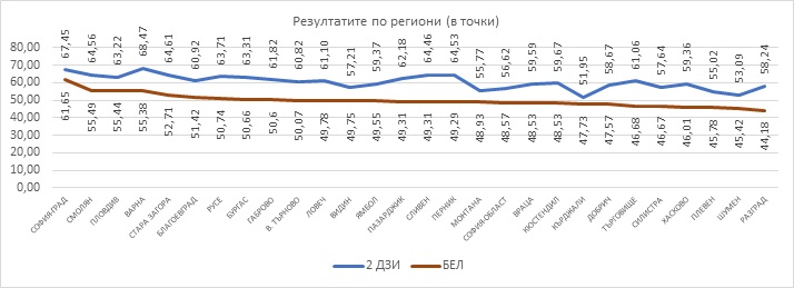 София, Смолян, Пловдив, Варна са по традиция сред регионите с най-високи резултати. Разместване в сравнение с минали години има сред регионите с по-слаби резултати. По български език и литература най-зле са се справили зрелостниците в област Разград, а на втората задължителна матура – в област Кърджали.