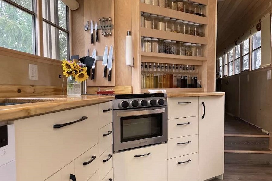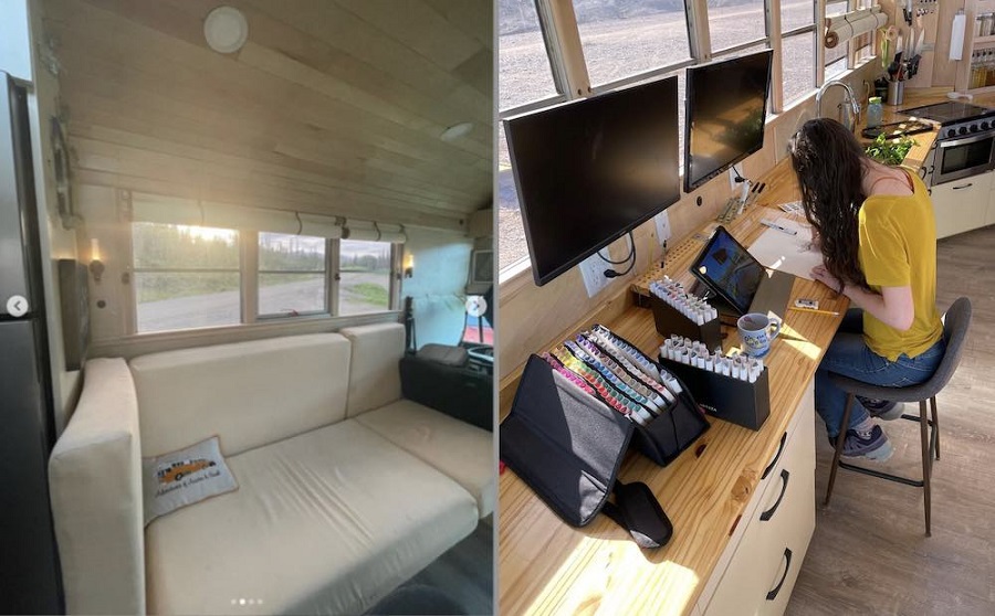 Сега наречен „Aurora the Adventure Bus“ в Instagram, автобусът разполага с тавани от кленово дърво, душ, кухня с пълно оборудване, слънчеви панели и сателитен интернет. Цялото преобразуване в крайна сметка струва на двойката 80 000 долара, споделят те пред Business Insider, което е много по-високо за типичните преобразувания на автобуси.