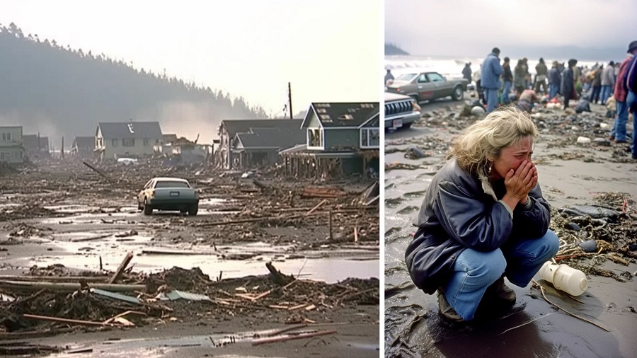 Още по-реалистична нишка от изображения показва земетресение с магнитуд 9,1 и цунами на западния бряг на Северна Америка през 2001 г., което очевидно е унищожило къщи и пътища в Сиатъл, Портланд, а също и части от Канада.