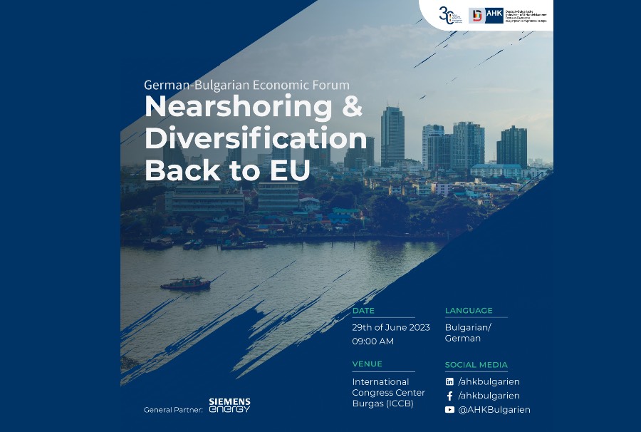 ГБИТК ще проведе германо-български икономически форум на тема: „Nearshoring and diversification back to EU“ на 29-ти юни 2023 г. (четвъртък) в Международен конгресен център в Бургас за по-нататъшно насърчаване на двустранните икономически отношения между България и Германия.