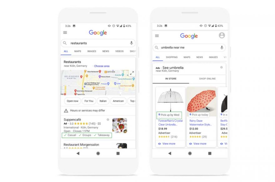 Google също така казва, че търсенията, съдържащи „налични в близост до мен“, са се увеличили с повече от 2 пъти в различните региони и категории – и благодарение на тези по-специфични опции за пазаруване, Google също добавя опции „Вземане по-късно“ за реклами на местни продукти.