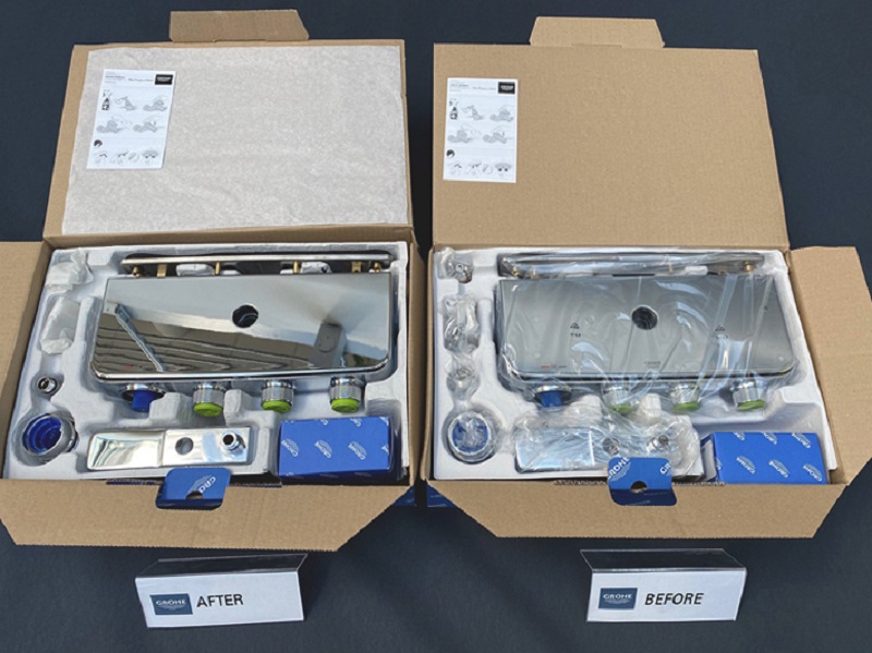 Използването на опаковки с намалено съдържание на пластмаса може да бъде постигнато само чрез комплексен подход, включващ нови иновации и модификации – необходимо е мислене извън кутията. GROHE разработва и интегрира някои прости, но въздействащи промени.