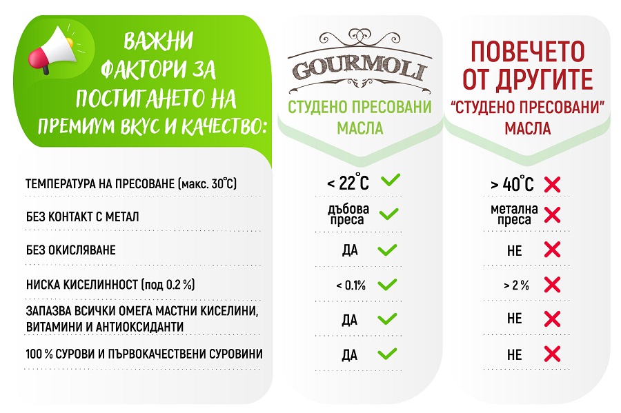 - Никъде в производствения процес ядките не минават термична обработка, защото сурово е най-полезно! Нито ги запичаме предварително, нито пресата развива висока температура, както всички останали. Нашата температура на пресоване е едва 20оC. Това запазва кехлибарения цвят и вкуса на пресни орехи в маслото, без да горчи и да гранясва. И най-вече благодарение на използваната технология в нашите продукти всички полезни мастни киселини (Омега 3,6 & 9), витамини и минерали са ЗАПАЗЕНИ на 100%, защото при останалите конвенционални преси те биват унищожени от контакта с метал и загряването при пресоване до над 40-50оC.