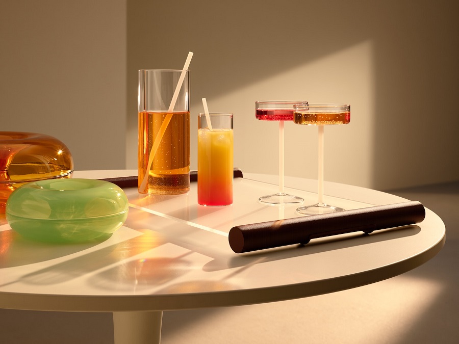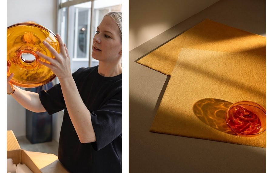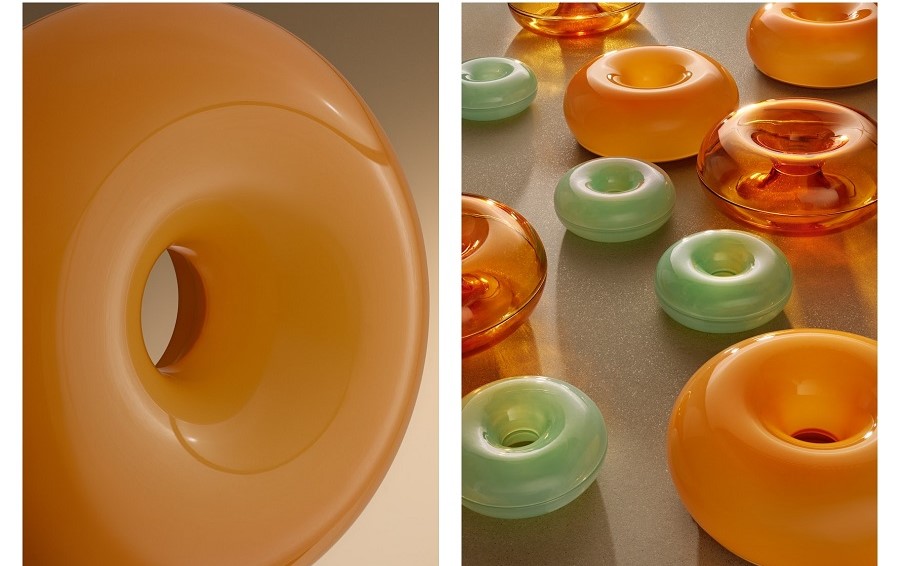 „Когато светлината преминава през оранжевото стъкло, овалната форма, наподобяваща поничка, блести с топъл оттенък“, споделя Сабин Марселис. „Това е магическа гледка, която привлича окото – независимо дали предметът е поставен върху масата или виси на стената“, добавя тя.