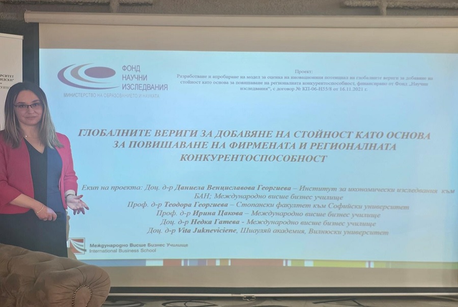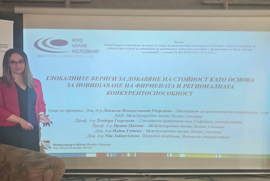 В рамките на Академия Иновации в агробизнеса – Готови за бъдещето, изследователи представиха резултати от Делфи проучване по проект „Разработване и апробиране на модел за оценка на иновационния потенциал на глобалните вериги за добавяне на стойност като основа за повишаване на регионалната конкурентоспособност“ с бенефициент Международно висше бизнес училище. Проектът е финансиран от Фонд научни изследвания с договор № КП-06-Н55/8 от 16.11.2021 г.