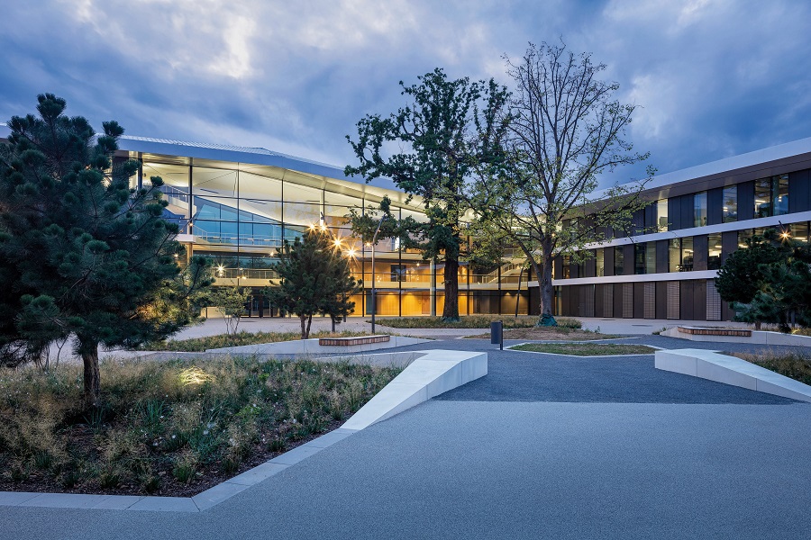 Китайски проект на хотел с елементи, напомнящи пагода, който все още не е пуснат в експлоатация, заема западната част. Тази директна близост на два проекта, които едва ли биха могли да бъдат по-различни в архитектурно отношение, само прави качеството на проекта на кампуса на ГФС (DFB) още по-забележително.