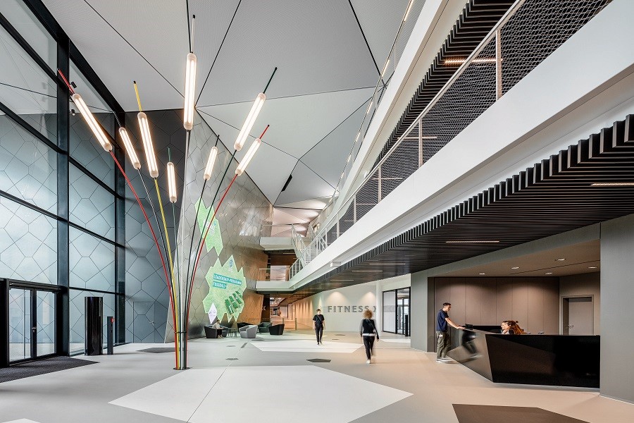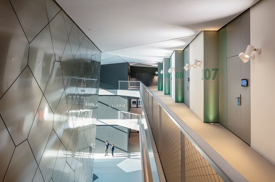 Най-разнообразни, но винаги висококачествени материали на всички повърхности представляват високите архитектурни стандарти на строителния предприемач, а над всичко се извисява „небе“ от триъгълни елементи от гипсокартон.