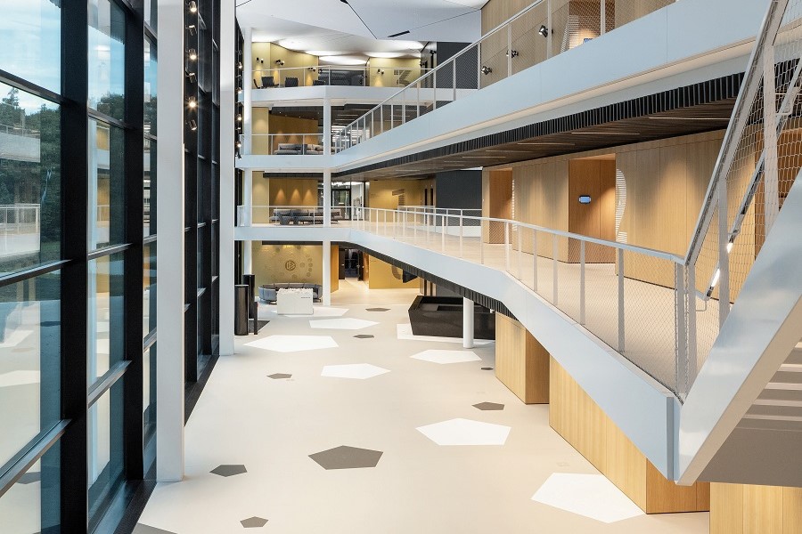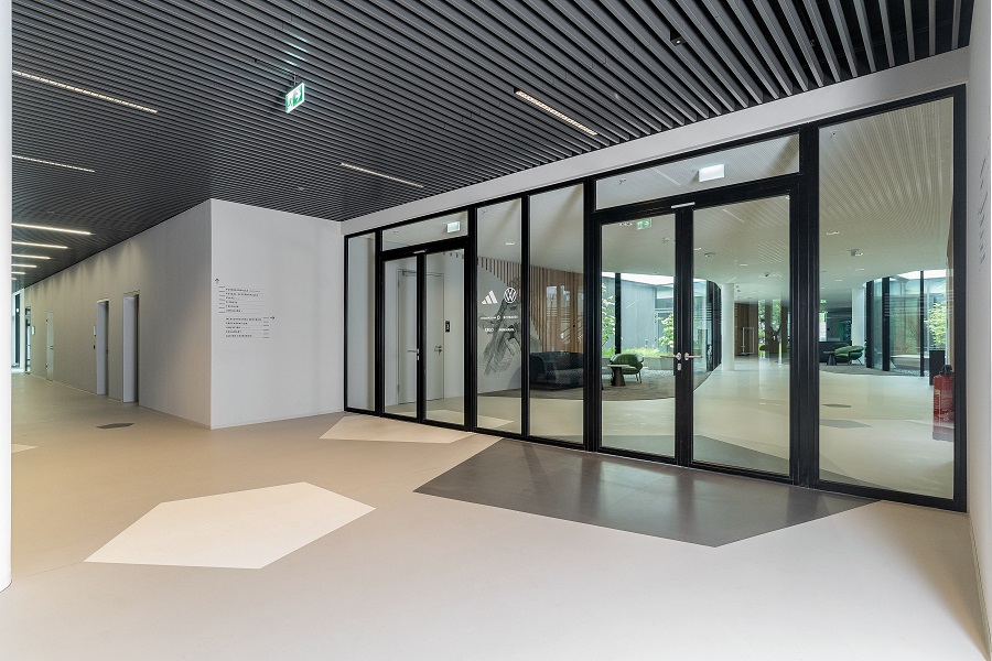 В случая на кампуса на ГФС (DFB) това става чрез врати за обекти със стоманена тръбна рамка и фиксирани остъкления, както и чрез пожарозащитни плъзгащи се врати на Hörmann. Двата продукта се вписват елегантно в проекта. Вратите за обекти с тръбна рамка T30 и T90 са изпълнени с фиксирано остъкление с идентична визия за естетична цялостна визия.