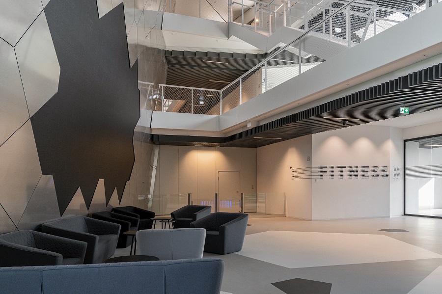 По продължение на булеварда се редуват различни „градски“ площади. Тук се предлага възможност за общуване, а през големите стъклени повърхности погледът винаги попада върху футболните игрища пред сградата.