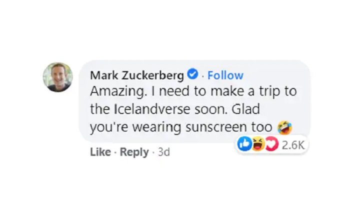 „Невероятно. Трябва скоро да посетя Исландската вселена. Радвам се, че използвате слънцезащитен крем“, написа Зукърбърг като коментар, вероятно във връзка с прословутата му снимка със слънцезащитен крем от Хавай.
