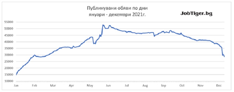 През последният месец на 2021г. обявите за работа във водещите сайтове са намалели с 35%, показва ежемесечния анали на динамиката на пазара на труда у нас на HR компания и кариерен сайт JobTiger. Въпреки големият, на пръв поглед, спад не бива да има основание за притеснение. Спадът на предложенията през декември е традиционен и основно се дължи на по-големия брой почивни дни за коледните и новогодишни празници, през които огромна част от работодателите не публикуват нови предложения за работа.