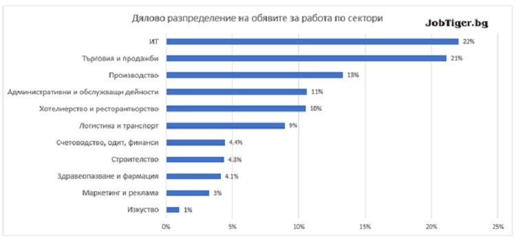 Секторът „ИТ“ вече заема първо място по дял с 22% от общия брой обяви. Според анализите на HR компанията и кариерен сайт JobTiger, това е най-бързо и динамично разрастващият се сектор през 2021г. От началото до края на годината броят на предложенията нарасна двойно, а като дял той се изкачи от четвърто място с 10-12% дял до първо с 22%.