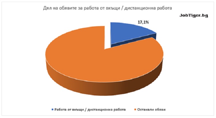 Предложенията за работа от вкъщи и/или дистанционна работа са намалели с 25% спрямо месец ноември. Техният дял спрямо общия брой обяви е 17,1%, като, подобно на предходните месеци, най-многобройни са те в сектора „ИТ“ (69%), следвани от „Административни и обслужващи дейности“ (14%) и секторите на аутсорсинг (BPO) индустрията (13%) и „Търговия и продажби“ (4%).