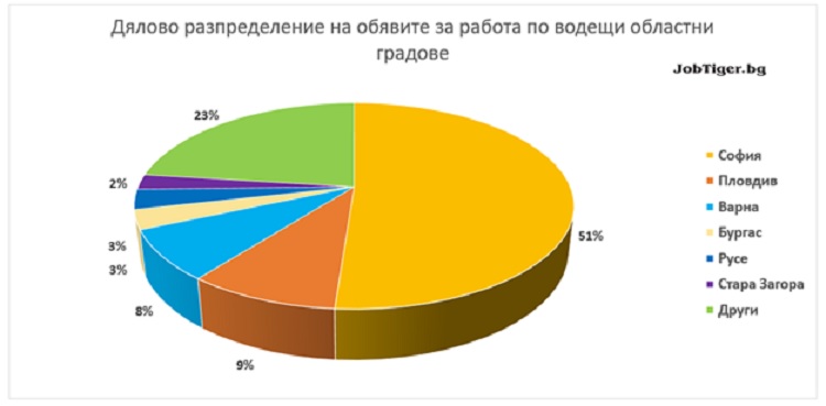През декември, повече от половината предложения в страната, са съсредоточени в столицата. Делът на тези обяви е 51% от всички предложния, а в останалите градове той е следния: Пловдив (9%), Варна (8%), Бургас (3%), Русе (3%) и Стара Загора (2%).