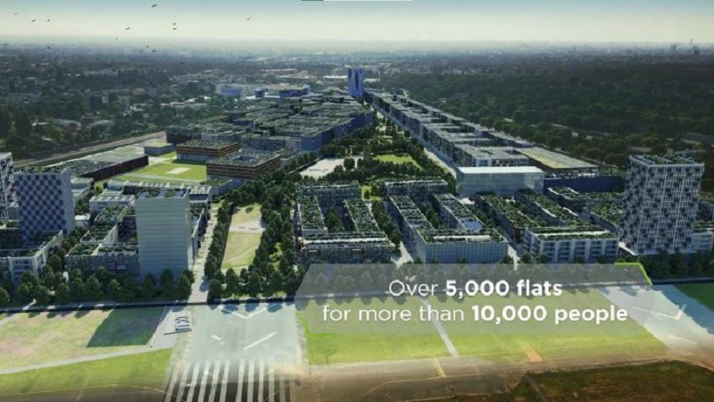 580 акра бивши летищни имоти се превръщат в устойчив квартал с широки открити зелени площи, велосипедни алеи и достъпни ефективни жилища.