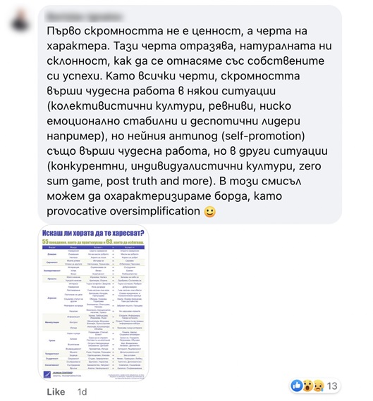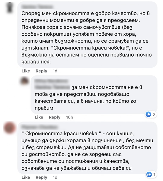 Мненията в социалните мрежи варират от искрено възмущение до опозицията, че скромността е главен виновник за това да не се борим за лични постижения и да не се гордеем с успехите си.