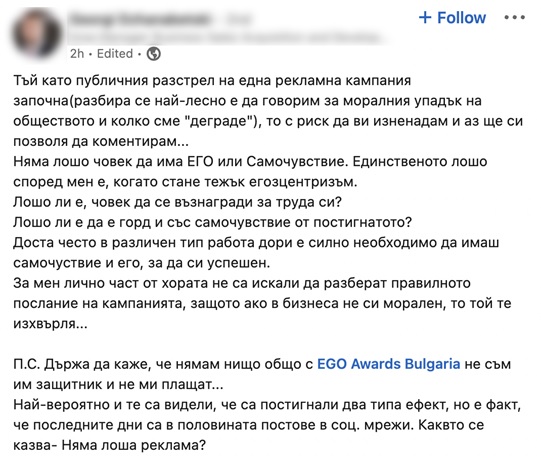 Организаторите на EGO Awards и провокативната билборд кампания “Скромността е за загубеняците – твоето Его” излязоха с официално становище, разясняващо идеята на кампанията: