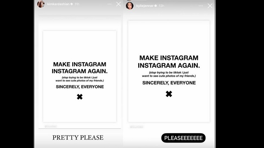 И двете споделиха публикации със своите последователи в понеделник, които гласяха „Направете Instagram отново Instagram“ и в скоби добавиха „спрете да се опитвате да бъдете tiktok, просто искам да виждам сладки снимки на моите приятели“.