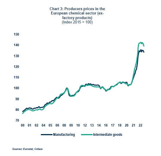 Влияние оказва и намаляването на цените на производителите след драматичния растеж, започнал през 2021 г. (графика 3) Тогава производителите на химикали се възползваха от високите производствени цени, но от началото на тази година те бележат спад. Оттогава насам търсенето се понижава.