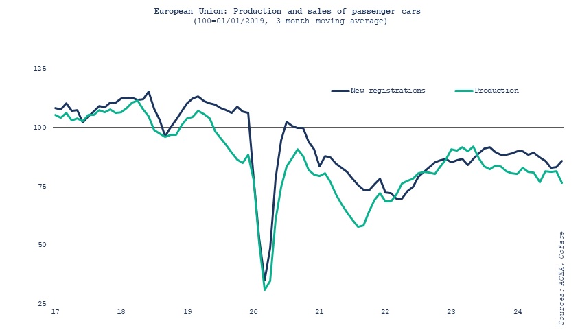 Европейската автомобилна индустрия претърпя сериозно забавяне през 2024 г. Търсенето на леки автомобили остава в застой, докато индустриалните показатели показват, че производствената дейност намалява в повечето страни в региона. Регистрациите на нови автомобили отбелязват слаб ръст от +0,8% на годишна база през 2024 г., но същевременно с това отчитат и спад от 3% на годишна база през втората половина на годината.