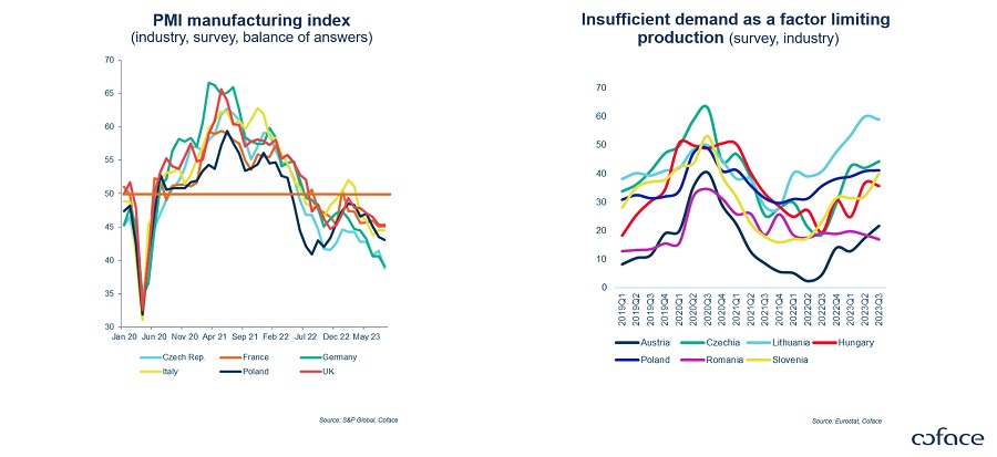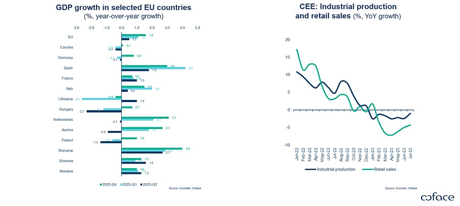 Също толкова предизвикателна е ситуацията и в Централна и Източна Европа. Има страни, които отбелязват значителни отрицателни стойности на БВП – такива са Чехия (-0,4% за 2023-Q2 срещу +1% за 2022-Q4), Унгария (-2,3% за 2023-Q2 срещу 0,7% за 2022-Q4), Австрия (-0,9% за 2023-Q2 срещу +2,7 за 2022-Q4) и Полша (-1,4% за 2023-Q2 срещу +1 за 2022-Q4).