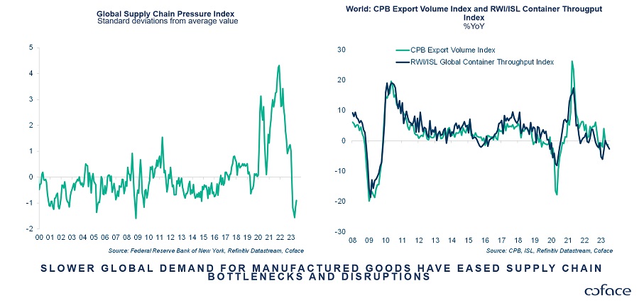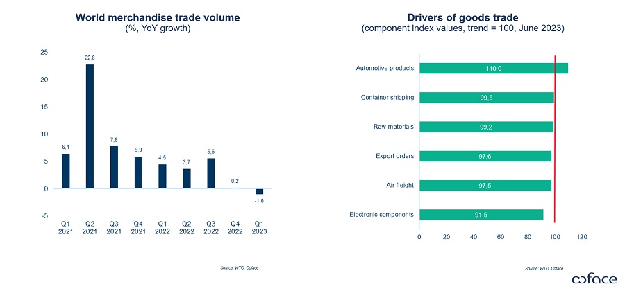 В допълнение, експертите от Кофас наблюдават продължително свиване на обема на световната търговия със стоки. То е започнало още в края на 2022 г. (+0,2%), като през първото тримесечие на настоящата година придобива дори отрицателни стойности (-1,0%). В контекста на този отрасъл се разглеждат бизнеси, представени в т.нар. „движеща сила“. На първо място в класацията са продуктите, касаещи автомобилната индустрия. Последно място заемат електронните компоненти, които бяха негативно повлияни от постоянно високата инфлация и отражението ѝ върху покупателната способност.