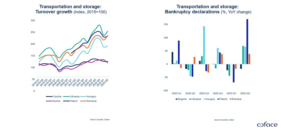 По отношение на транспортния сектор в ЦИЕ, експертите отчитат увеличен оборот, но за сметка на това и повишение на регистрираните фалити. През първото тримесечие на 2023 г. несъстоятелността в този отрасъл се характеризира с изцяло отрицателни стойности. През следващото тримесечие обаче тя рязко се повишава – най-вече в Полша, където надхвърля 150 процентни пункта. Тази тенденция обаче не важи за България – за разлика от други държави в ЦИЕ, страната ни запазва отрицателни стойности на регистрирани фалити.