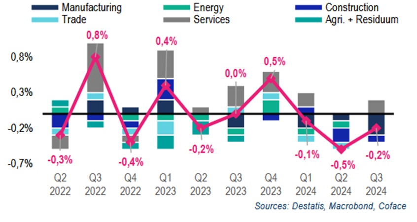 Икономиката на Германия е в стагнация вече десет тримесечия. Дори данните за третото тримесечие на 2024 г. не променят тази картина, въпреки че лятото се отличаваше със значими събития като Европейското първенство по футбол и големите концерти на Тейлър Суифт и Адел, които иначе биха стимулирали частното потребление. Във финалното издание на данните за БВП обаче това не е взето предвид. През третото тримесечие (Q3) БВП намалява с 0,1 процентни пункта. За пореден път стойностите на БВП са ревизирани надолу, с малки изгледи тази тенденция да се промени в краткосрочен план. Именно затова прогнозата на Кофас очертава понижаване от -0,1% на -0,2% за 2024 г. и минимален растеж през 2025 г (0,4% вместо 0,8%).