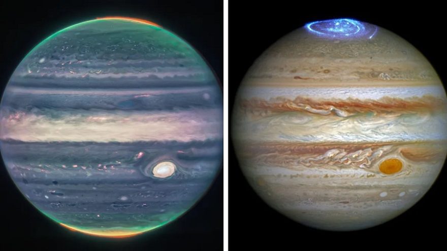Астрономите се заинтересуваха да видят как изглеждат полярните сияния на Юпитер и заснеха планетата в ултравиолетова светлина с космическия телескоп Хъбъл, за да ги видят. По-малко от десетилетие по-късно JWST улови полярните сияния с близка инфрачервена камера (NIRCam).